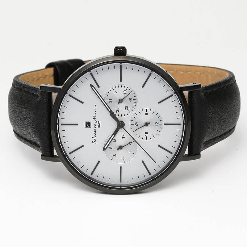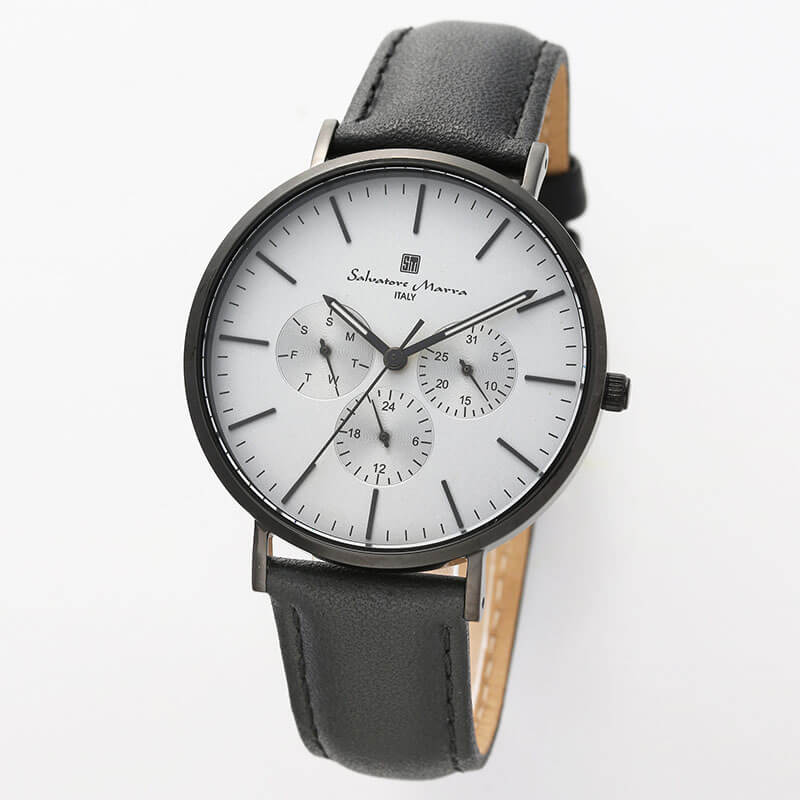 38mmケースは腕への納まりもよく、ペアウォッチとしてもオススメです型番SM22102-BKGYケース材質:ステンレススティールサイズ約:径38mm×厚:8.2mm重:36gベルト幅:18mmベルト材質:レザーカラー:ブラックベルト腕周り最少:14cmベルト腕周り最大:19cmムーブメントクォーツ(電池式)機能風防:ミネラルクリスタルガラス日付表示曜日表示24時間計防水機能防水性:日常気圧防水(3気圧防水)付属品SalvatoreMarra純正BOX保証書取扱説明書※説明書・保証書に関して入荷時期により仕様、内容が一部異なる場合がございます。