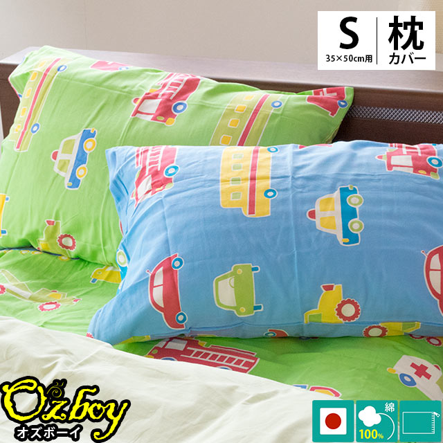 ピローケース 35×50cm 綿100% 日本製 westy「オズボーイ2」 消防車やクレーン車など車柄 くるま柄 ブルー グリーン 男の子 ピローケース ピロケース まくらカバー 枕カバー 35×50【あす楽対応】【CTN】