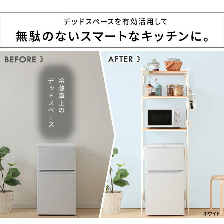 ■商品サイズ(cm)外寸:幅約58×奥行約39×高さ約180可動棚:幅約55.5×奥行約39バスケット 内寸:幅約28×奥行約7 外寸:幅約30×高さ約22.5×奥行約10.5■対応冷蔵庫幅55cmまで■耐荷重全体:約22kg可動棚:約12kgバスケット:約3kg■素材本体:スチール(粉体塗装)棚板:低圧メラニン化粧版ペーパーホルダー・バスケット:スチール(粉体塗装)■カラーホワイト・ブラック電子レンジもまとめ収納☆