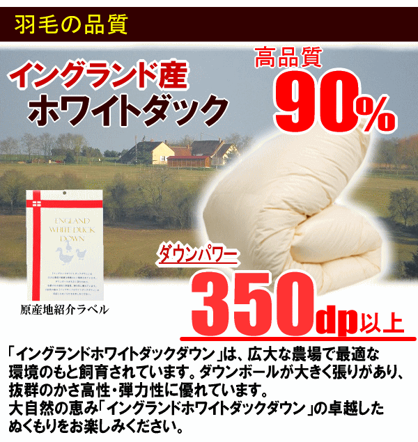 ■サイズ:170x210cm ■中身:イングランド産ホワイトダックダウン90% フェザー10% 側生地:ポリエステル80% 綿20% ■充填量:1.3kg ■仕様:二層キルト、ダウンパワー350dp以上、エクセルゴールドラベル 8箇所ループ付き ■生産国:日本 ■送料無料:北海道・沖縄・離島は別途送料がかかります。