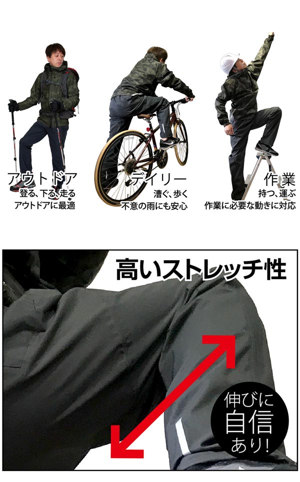 雨や風は通さずに、発汗によるムレを逃がす透湿防水素材を採用。