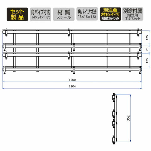 仕様サイズ:1200mmカラー:クロームスリット穴掛け式棚等設置システムのスラックスハンガー用フック設置専用セット金具切断対応可能(但しスラックスフック装着間隔を考慮して、15mmの倍数指定推奨品)材質:スチール(横パイプ規格14×24×1.6t・縦パイプ規格16×16×1.6t)フック脱落防止用パーツ付(専用ネジ類、および6φ線材)※商品画像はイメージです。