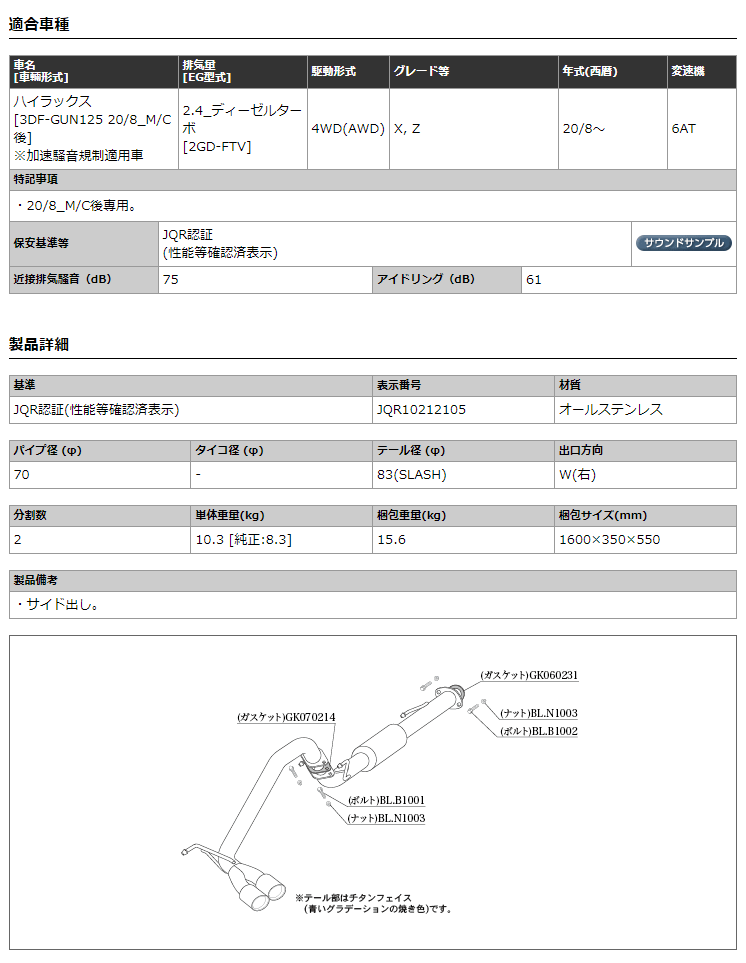 ご購入前にメーカーさん公式サイトも合わせて御参照下さい ※取付けに際して別途別売の吊りゴムを必要とする場合がございます 詳細はメーカーさん公式サイトで確認してください ※車検対応マフラーは車検通過保証があるものではありません。