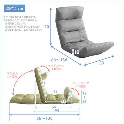 商品に関しまして【商品について】日本製リクライニング座椅子(布地、レザー)14段階調節ギア、転倒防止機能付き | -- ■サイズ:外寸:(約)幅53x奥行き66〜136x高さ12〜70cm(座面高:12cm)※商品重量:(約)8kg■カラー:ファブリックタイプ:グリーン、ターコイズブルー、グレー、ネイビーレッド、ブラウン、ブラック、ベージュPVCレザータイプ:レッド、ブラック、アイボリー、ブラウン■素材:表地(ダリアン、タスク):ポリエステル100%表地(PVCレザー):合成皮革裏地:ポリエステル100%構造部材:スチールパイプクッション材:ウレタンフォーム■その他:・完成品でのお届けです。