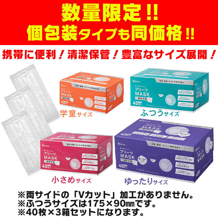 <学童サイズ>>●内容量30枚×4箱セット●商品サイズ(cm)幅約13.5×高さ約8●主要材質本体・フィルター:ポリプロピレン耳ひも:ポリウレタン、ポリエステルノーズフィッター:ポリエチレン <小さめサイズ>>●内容量30枚×4箱セット●商品サイズ(cm)幅約14.5×高さ約9●主要材質本体・フィルター:ポリプロピレン耳ひも:ポリウレタン、ポリエステルノーズフィッター:ポリエチレン <ふつうサイズ>>●内容量120枚×1箱セット●商品サイズ(cm)幅約16.5×高さ約9●主要材質本体・フィルター:ポリプロピレン耳ひも:ポリウレタン、ポリエステルノーズフィッター:ポリエチレン (検索用:ディスポーザブルプリーツマスク・ふつうサイズ・120枚入・プリーツ型・風邪・ウイルス・インフル・飛沫感染・咳・鼻水・花粉・ディスポーザブル・ぷりーつますく・ふつうさいず・4967576534277・アイリスオーヤマ)★